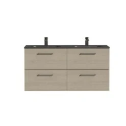 Door het strakke en tijdloze design past dit Tiger Studio badkamermeubel in iedere badkamer. Deze wastafelonderkast heeft 2 ruime lades om alle badkamerspullen overzichtelijk in op te bergen. De lades zijn uitgerust met hoogwaardige ‘soft close’ geleiders waardoor ze geruisloos sluiten. De warme houttint geeft een sfeervol karakter aan het meubel. Daarnaast krijgt het meubel, door de voelbare houtnerf, een mooie natuurlijke uitstraling. De mooie, zwart matte polybeton wastafel met ovale waskommen en rvs grepen maken deze set compleet.