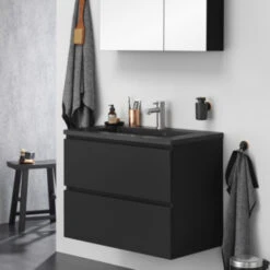 Daarnaast bestaat deze set uit een matzwarte polybeton wastafel met natuursteen look. Tijdens het ontwerpproces van de waskom is goed nagedacht over een juiste balans tussen design en functionaliteit. Polybeton wastafels zijn hygiënisch en gemakkelijk in onderhoud. De wastafel heeft een externe overloop en 1 kraangat. Voor het overloopgat wordt een sierring in zowel chroom als zwart meegeleverd waardoor deze altijd mooi aansluit bij je badkameraccessoires.