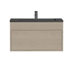 Het Tiger Helsinki badkamermeubel is een simplistisch, modern en greeploos meubel in Scandinavisch design. De wastafelonderkast is voorzien ruime lades waarin alle badkamerspullen overzichtelijk opgeborgen kunnen worden. Voor extra comfort is deze onderkast voorzien van handige ‘push to open’ lades waardoor ze al middels één simpele aanraking openen. De warme houttint geeft een sfeervol karakter aan het meubel. Daarnaast krijgt het meubel, door de voelbare houtnerf, een mooie natuurlijke uitstraling. De stakke, mat zwarte polybeton wastafel met immitatie natuursteen look maakt deze set compleet.