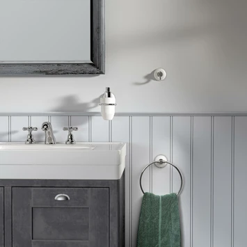 “De zeepdispenser uit de Tiger Ivy serie is uitgevoerd in de kleur chroom in combinatie met wit keramiek. De zeepdispenser heeft royale een inhoud van 200 ml. De Ivy serie bevat tevens een groot aantal aanvullende accessoires voor de badkamer en het toilet in dezelfde stijl. De zeepdispenser is tevens geschikt voor montage met TigerFix type 1, waarmee accessoires snel en eenvoudig op een gladde, harde ondergrond te bevestigen zijn door middel van een gepatenteerd lijmsysteem. Boren is niet noodzakelijk en de accessoires zijn eenvoudig te verwijderen zonder dat er resten op de ondergrond achterblijven. TigerFix is apart verkrijgbaar. Heerlijk wegdromen in de badkamer in een landelijk klassieke sfeer doe je met de accessoires uit de Ivy serie. Vormgegeven in de kleur chroom met accenten in keramiek versterken de artikelen uit deze serie de elegante, romantische stijl van je badkamer.”